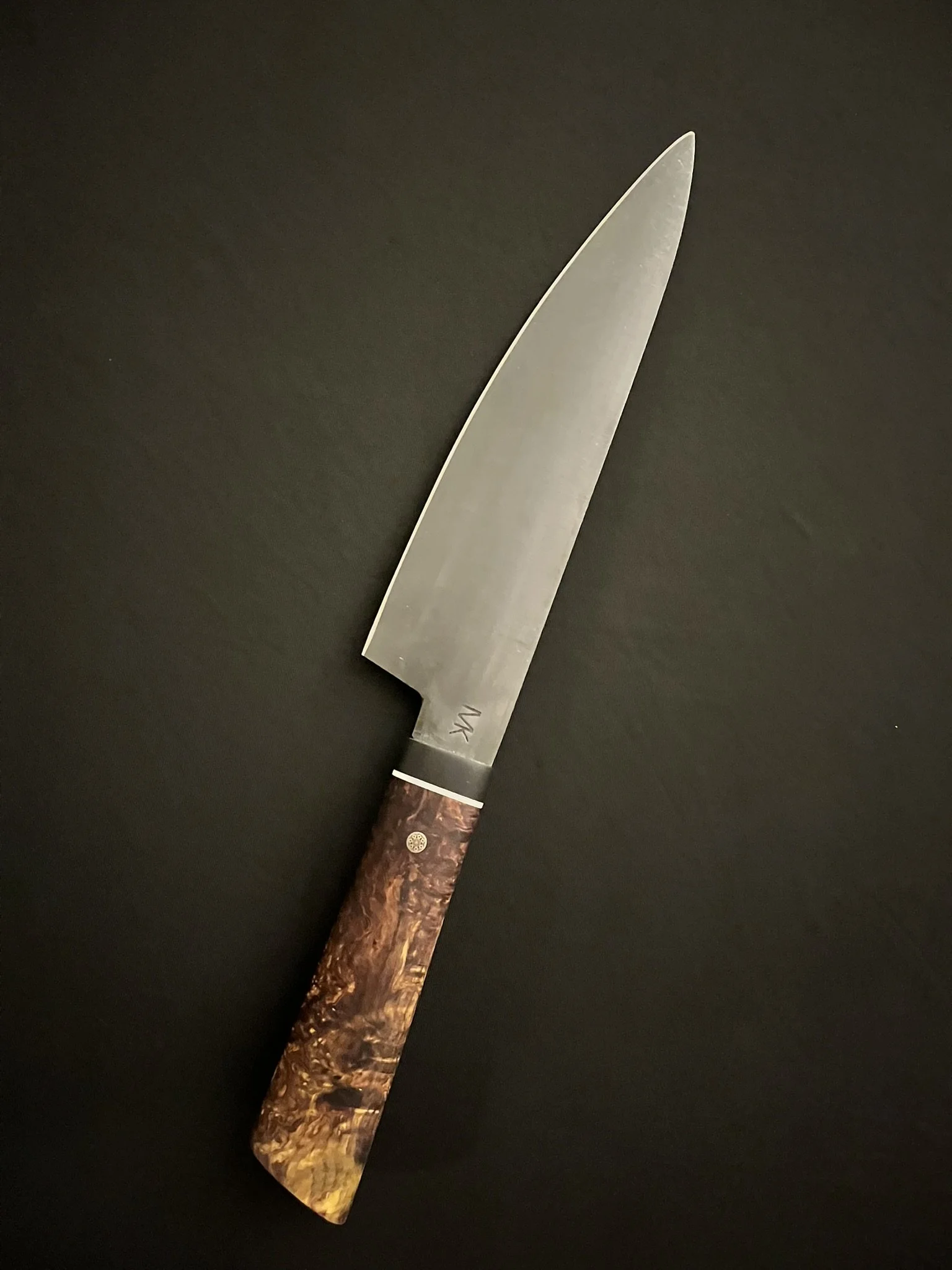 This Chef Knife was hand forged from 1075 high carbon steel and was acid etched to protect the blade. It has a Kerelian Birch and Ebony wood handle with a mosaic pin and G10 spacer. It has an overall length of 14 inches with an 8 inch blade and weighs 8.3 ounces. The slightly rounded belly makes this knife excellent to use with a rocking motion or a push cutting motion.