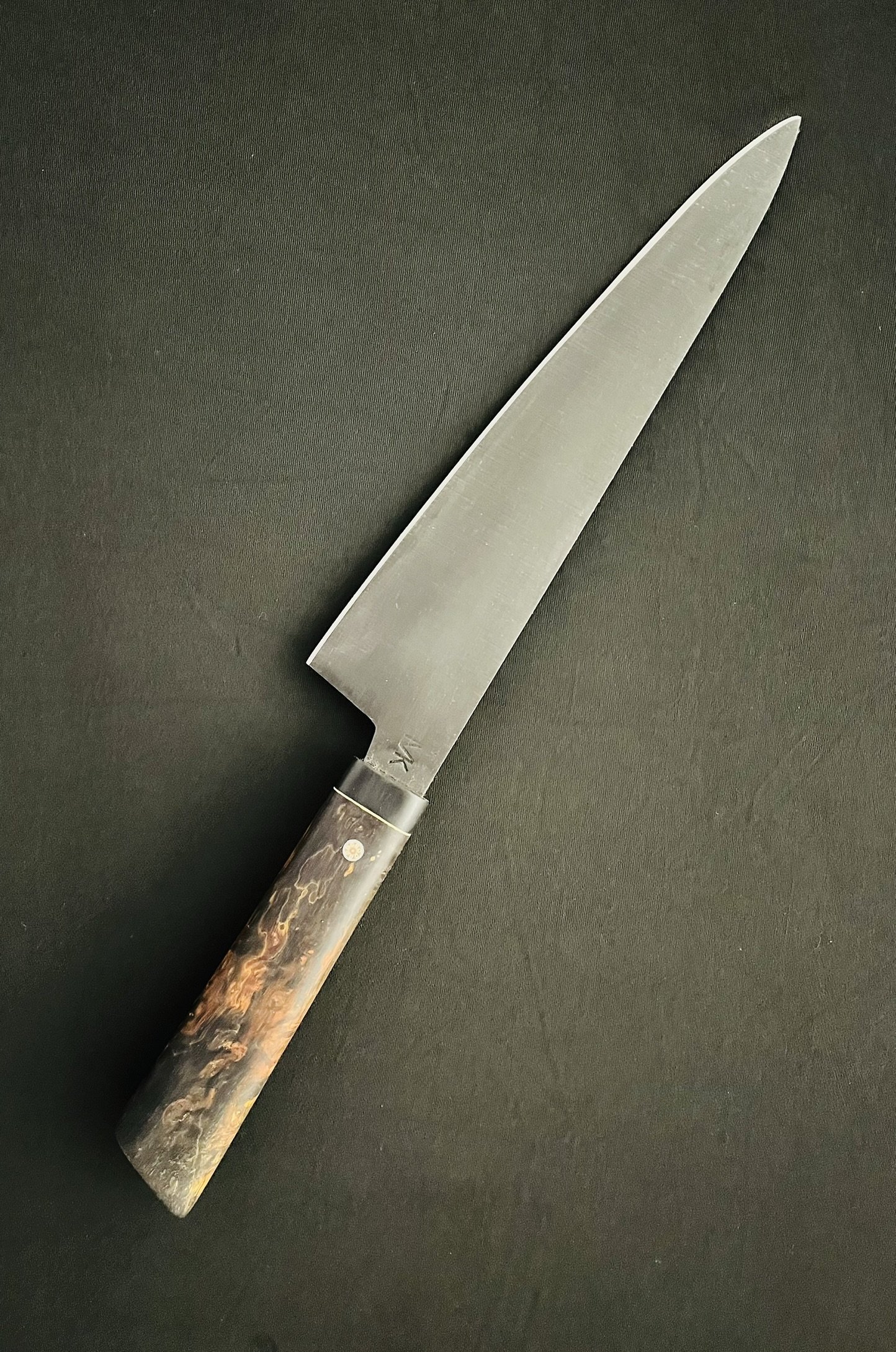 This Gyuto style Chef Knife is hand forged from 1075 high carbon steel and was acid etched to protect the blade from discolorization. The handle is Karelian Birch and Ebony wood with a mosaic pin and brass spacer. The knife has a total length of 15 inches with a 9 inch blade and weight of 8.6 ounces. The straighter edge favors a push and chopping cutting style. This knife is a workhorse and an heirloom piece!