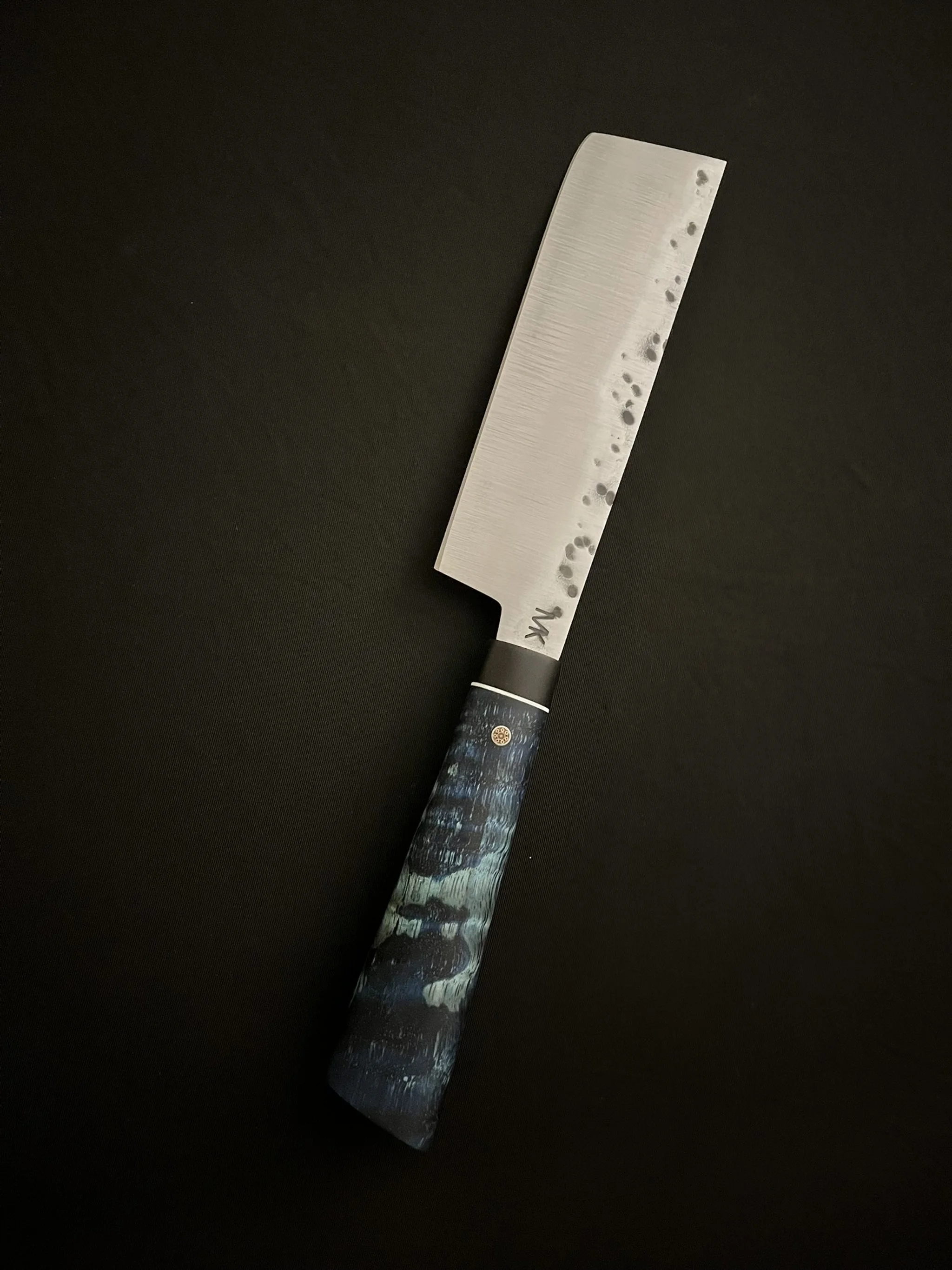 This Nakiri Chef Knife was hand forged from 1075 high carbon steel with a Kerelian Birch and Ebony wood handle. It is 13 inches total with a 6 ½ inch blade. The Nakiri is traditionally used as a vegetable cutting knife but is versatile enough to perform any number of other tasks.